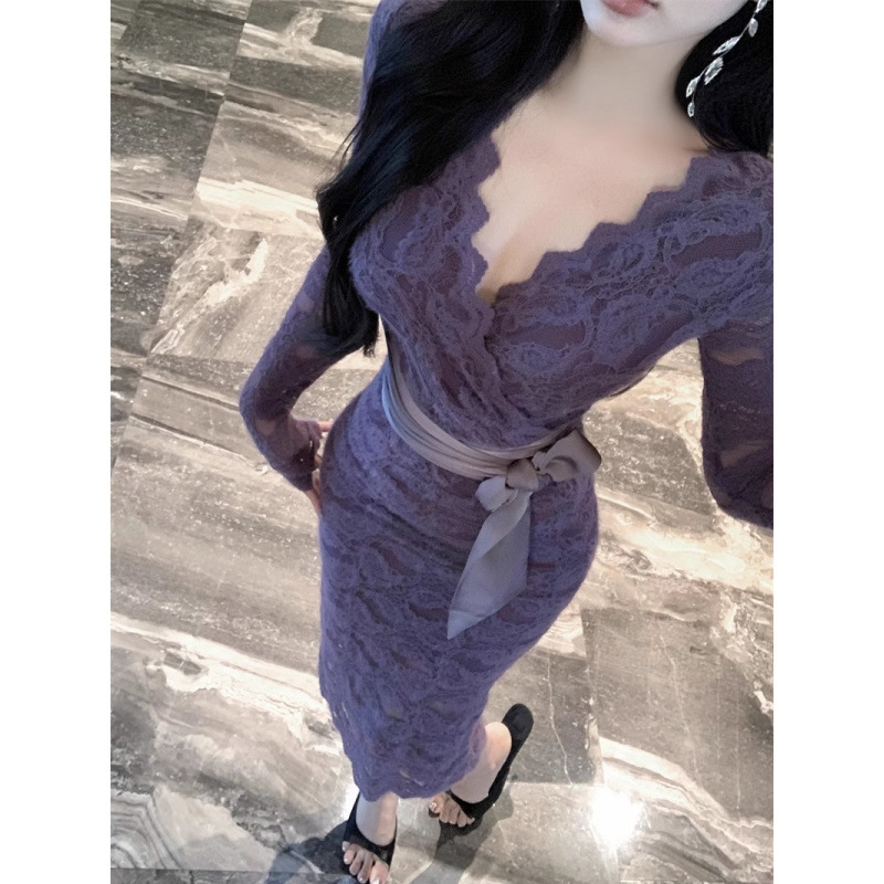 紫色领蕾丝连衣裙女秋季长袖修身绑带中长款轻熟风收腰包臀裙子