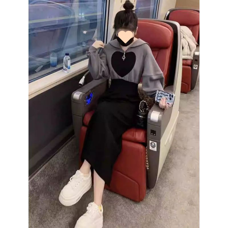 欧洲站高级感气质收腰连衣裙女春季爱心拼色娃娃领休闲卫衣长裙子