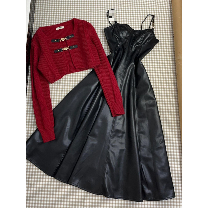 秋季小香风红色毛衣吊带连衣裙设计感两件套女